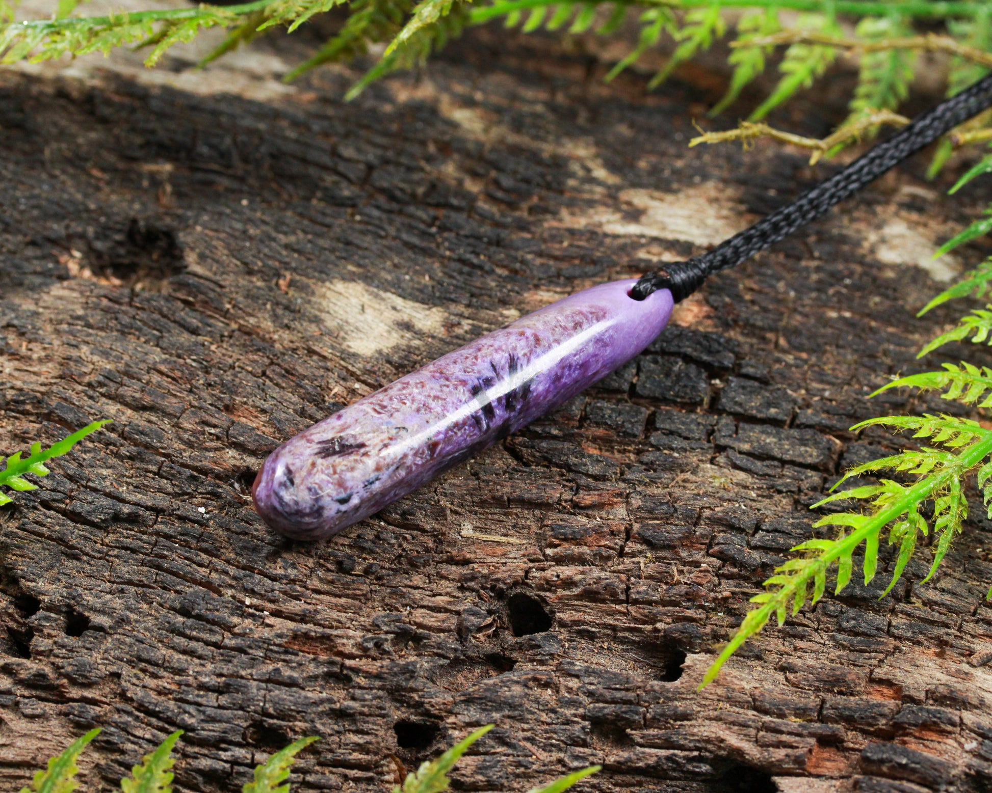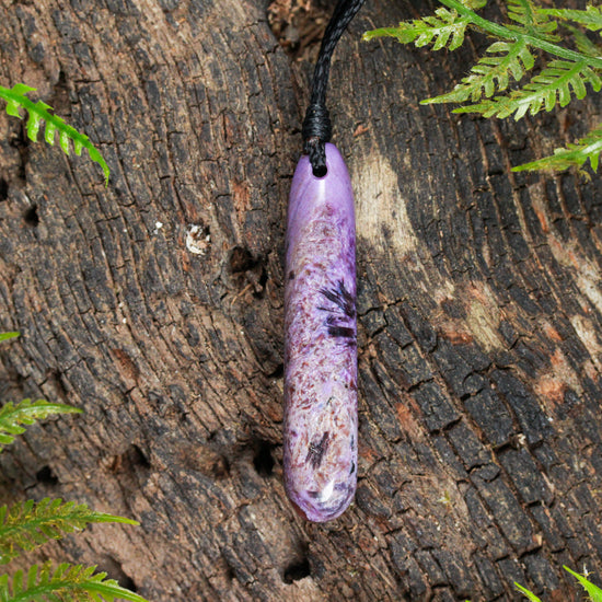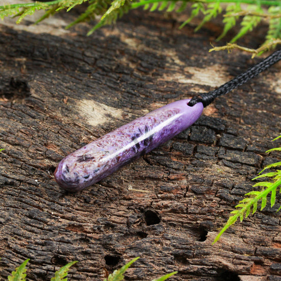 Beautifully coloured freeform Charoite Roimata pendant. Carved by Dean Taylor.