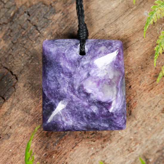 Beautifully coloured freeform Charoite Toki pendant. Carved by Dean Taylor.