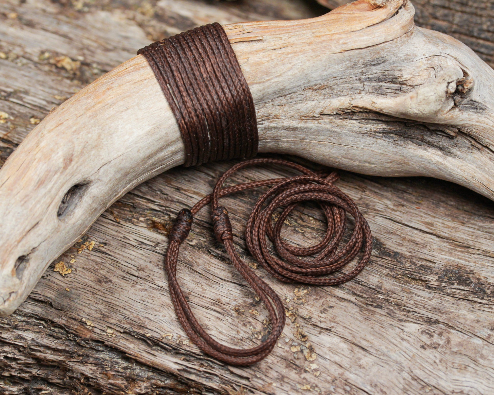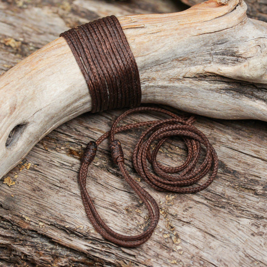 Nice strong coffee brown cord but soft. Comes with adjustable knots.