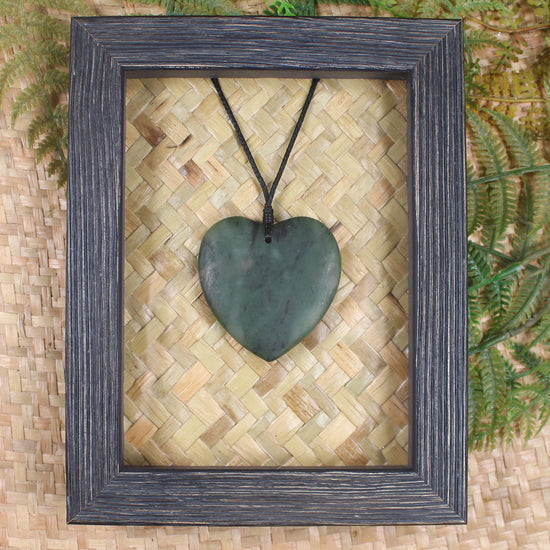 A matte Hapopo Pounamu Heart that has been framed to become a lovely wall hanging. Carved by Allan Moreton.