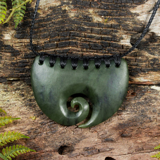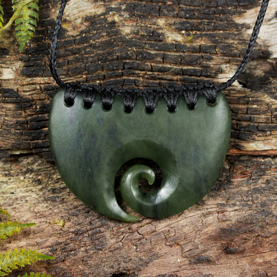 This stunning Shield with Koru carved from rich coloured Hapopo Pounamu is flattering to wear. Carved in our local studio.
