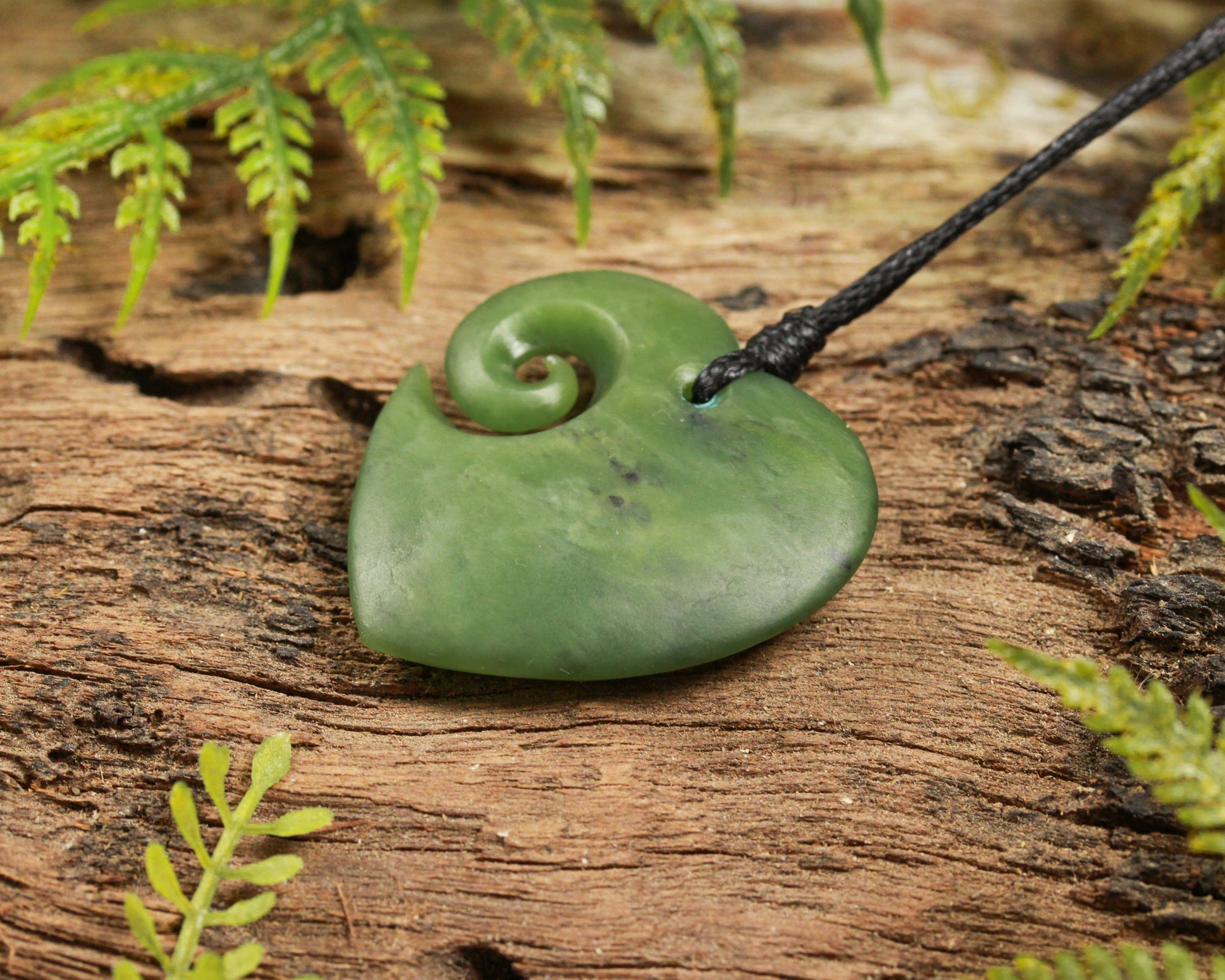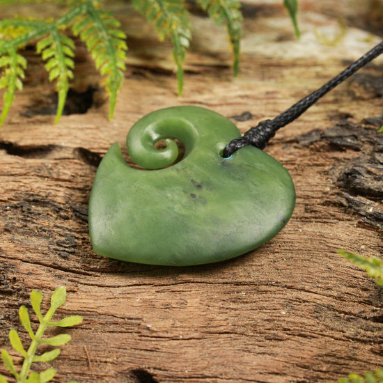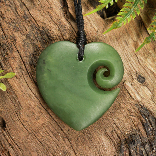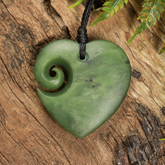 NZ Greenstone Medium Koru Heart Pendant (BK478) Hapopo Pounamu