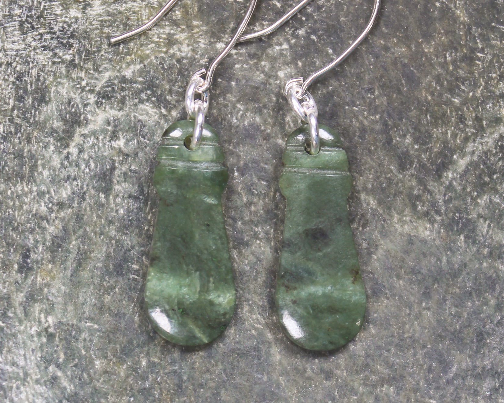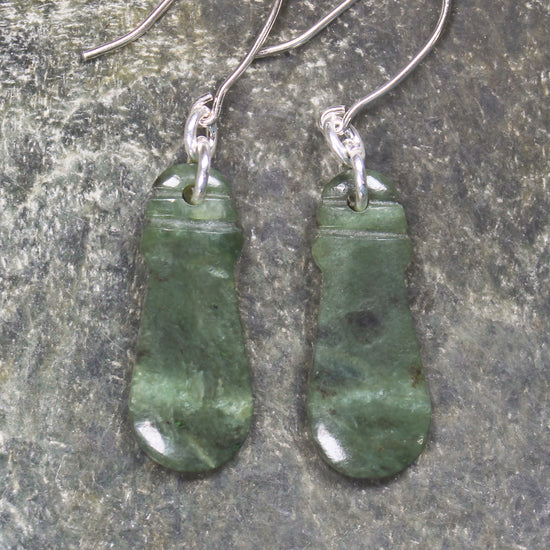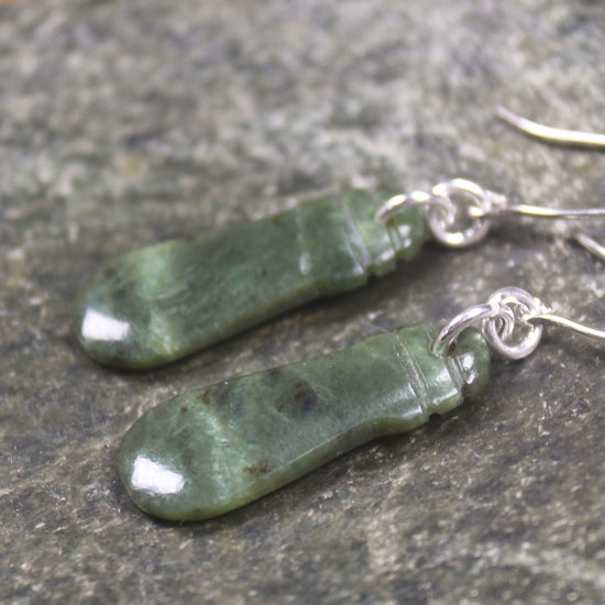 Mere Pounamu earrings. These have wonderful movement. Hand carved locally.