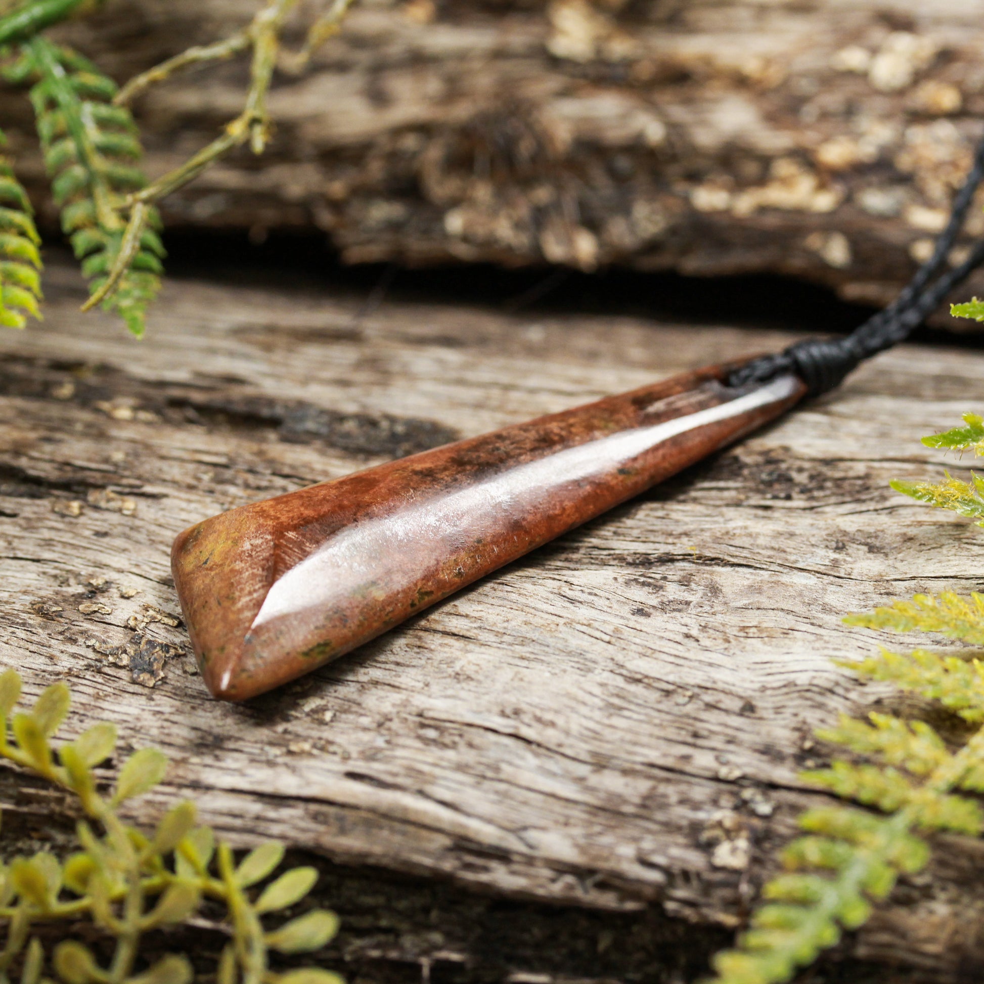 Beautiful freeform toki carved from fire treated pounamu. Fire treating pounamu is an old practice, and causes a change of colour to yellow, red and brown.