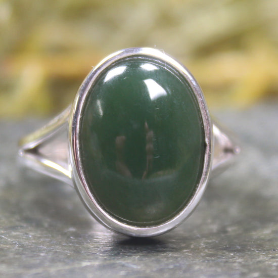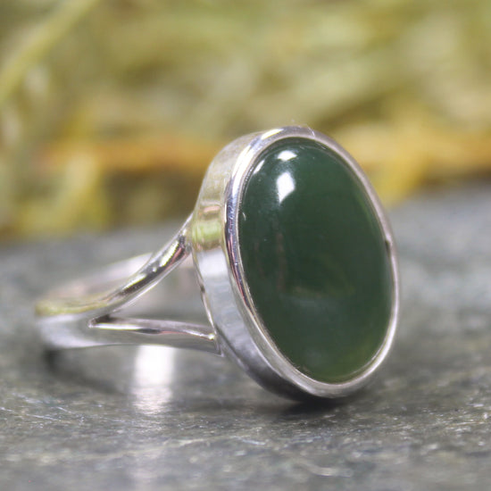 Stunning Sterling Silver Ring with hand carved Kawakawa pounamu from our local studio. Designed by Louise King.
