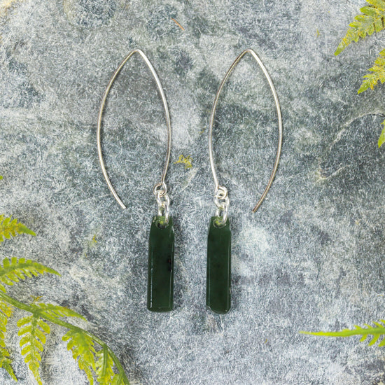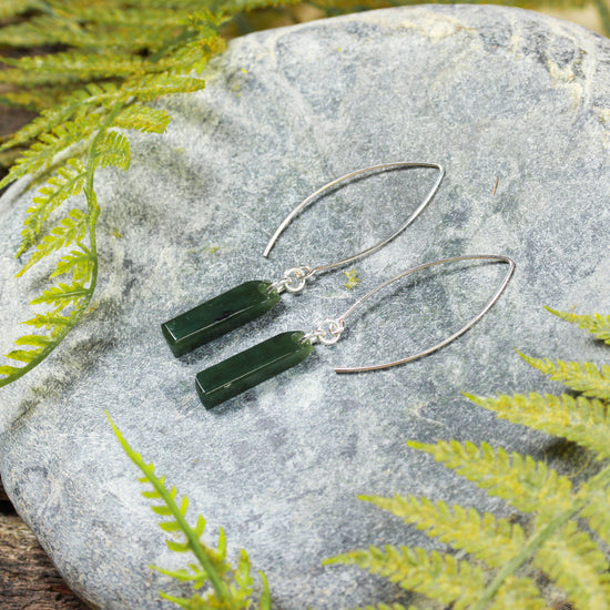 Toki Pounamu earrings with long sterling silver hooks. These have wonderful movement. Hand carved locally by Allan Moreton.