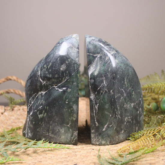 Stunning Book ends carved from NZ Serpentine Pounamu. Carved by Brownie Barlow. These sculptures come as a pair.